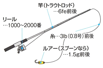 ・ルアー:(スプーン 1g〜3g) (プラグ トラウト用クランクベイト・ミノーなど、2cm〜7cm)がおすすめです!!
